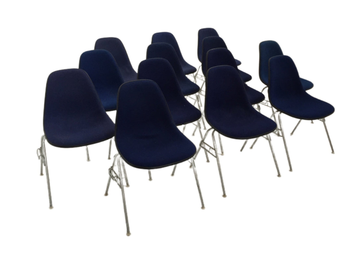 Silla apilable Herman Miller de fibra de vidrio con tela azul de Eames