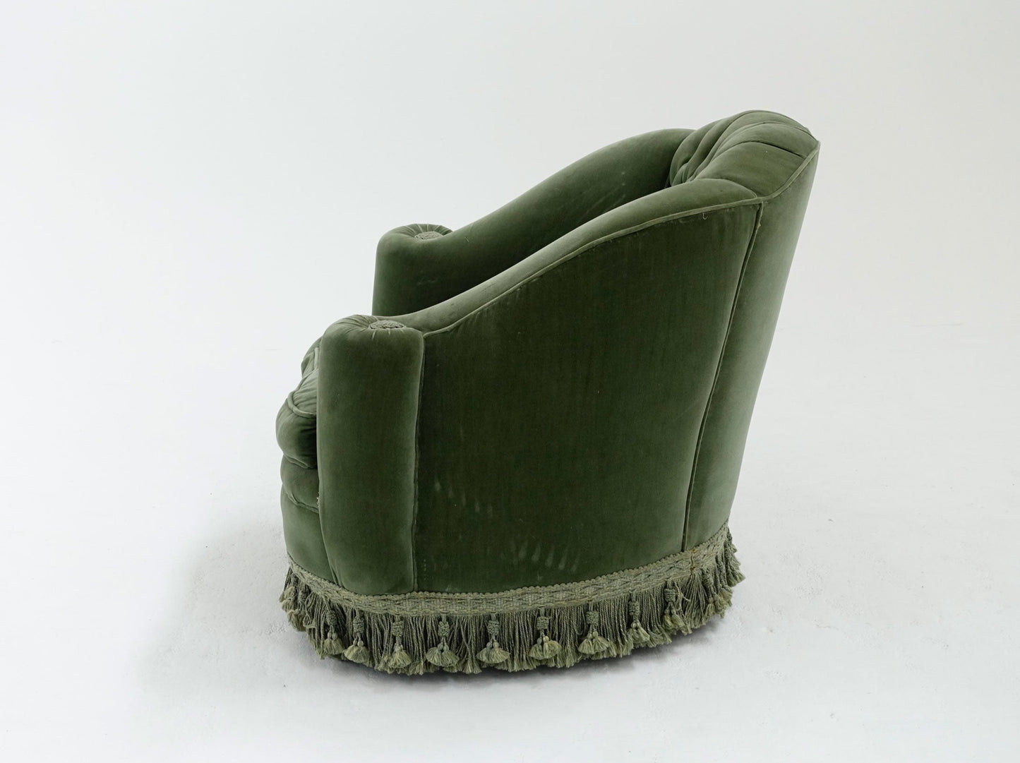 Sillón capitoné de terciopelo verde con flecos (marcas de presión)