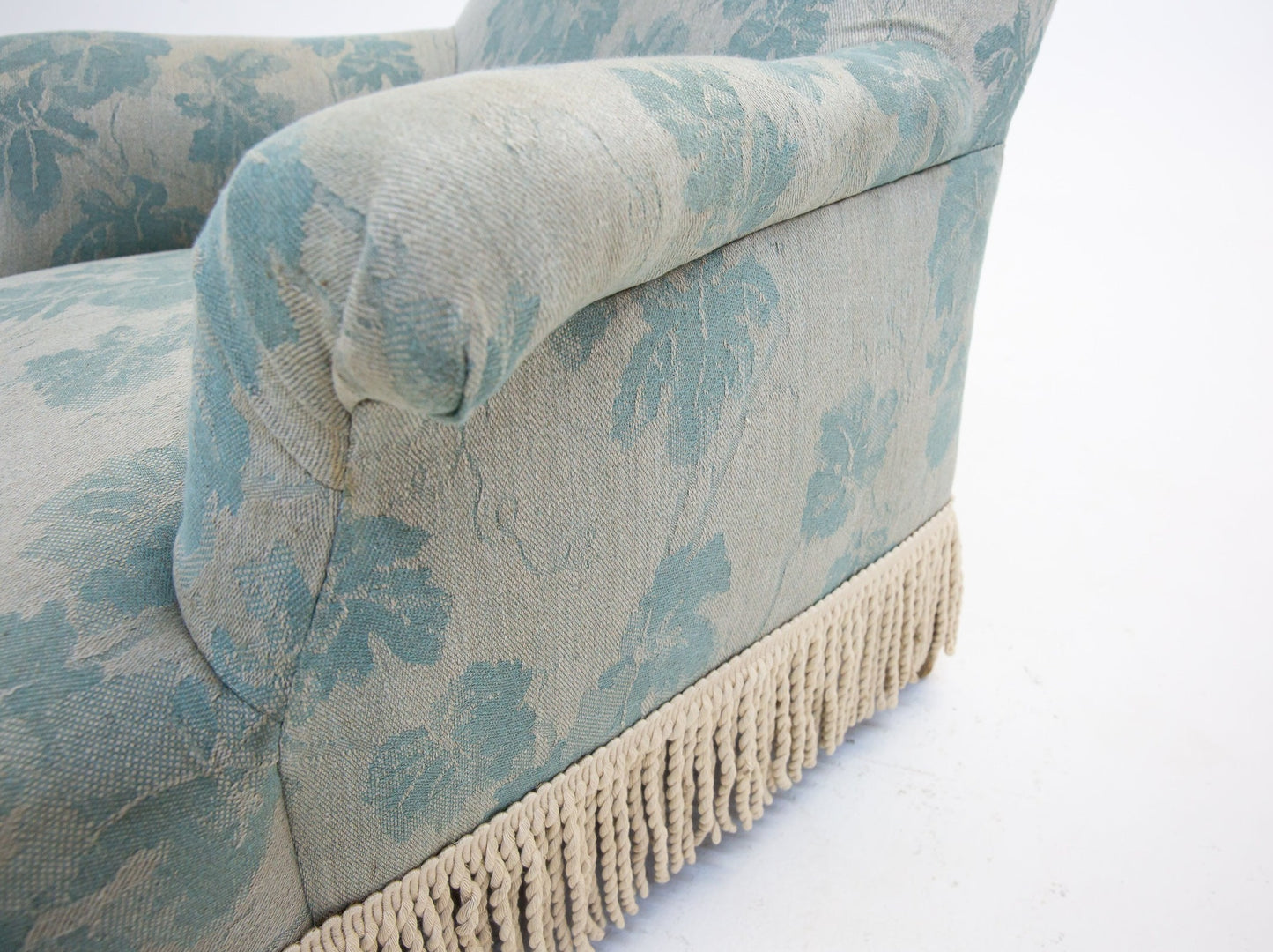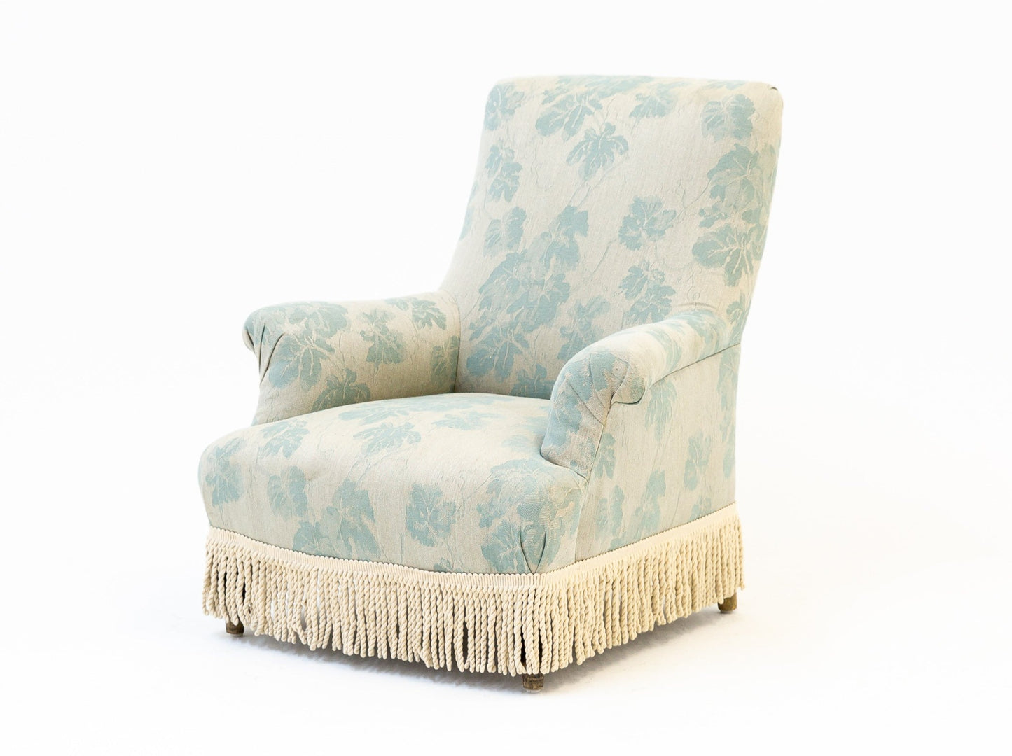 Sillón Napoleón III con flecos en tejido floral azul y crema