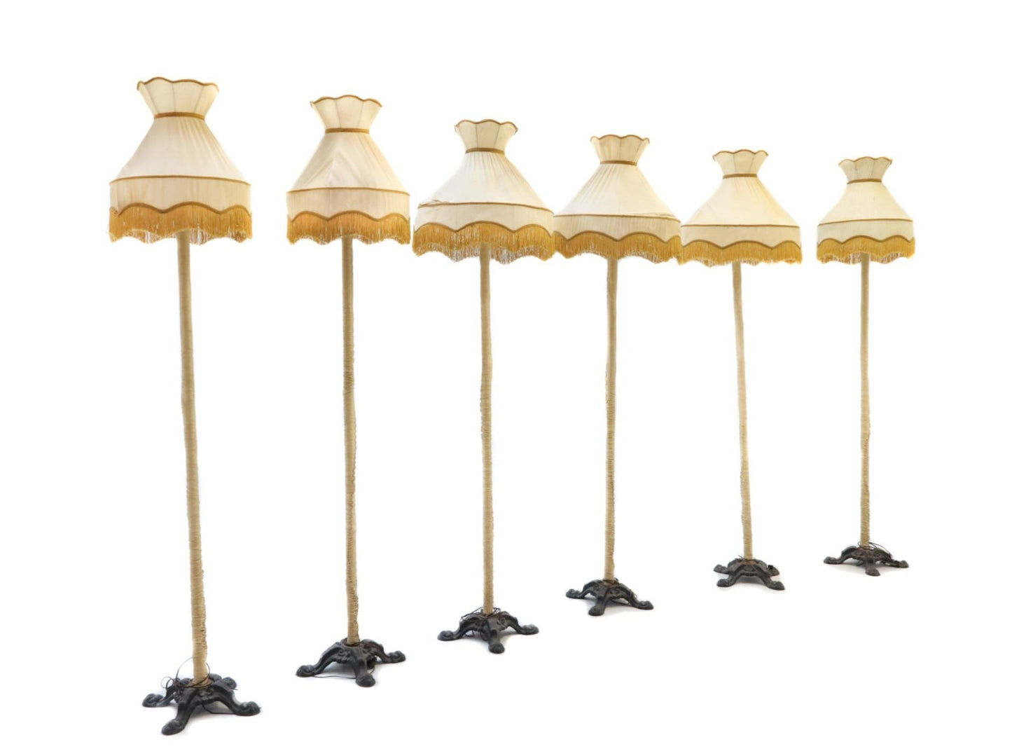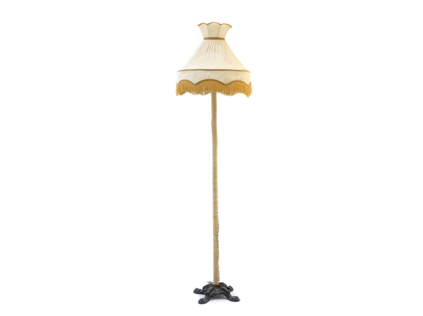 Lámpara de pie burlesca con pantalla de flecos blancos y dorados