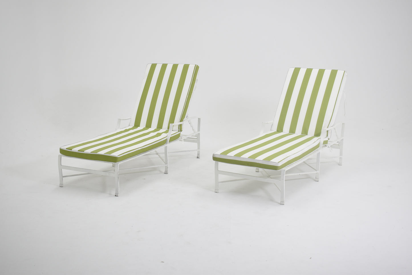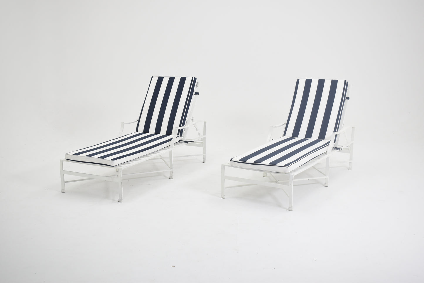 Silla tumbona de piscina de metal blanco con cojín blanco o azul