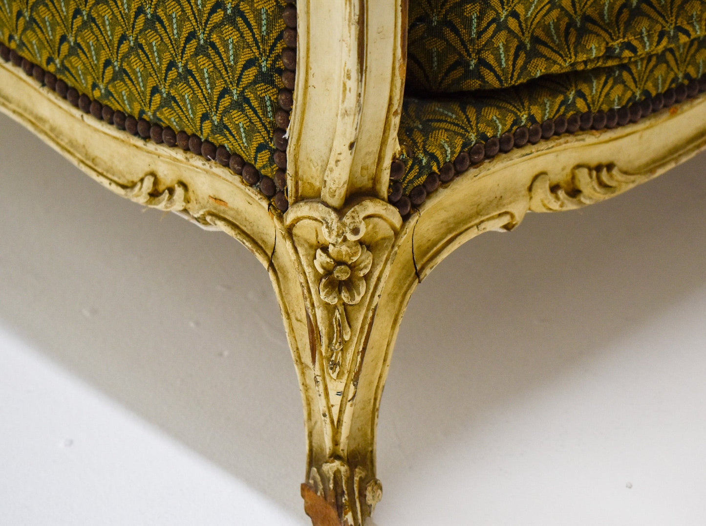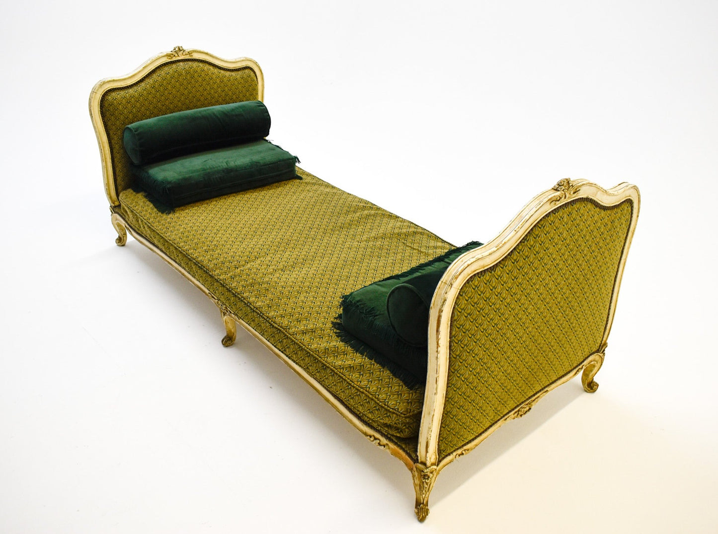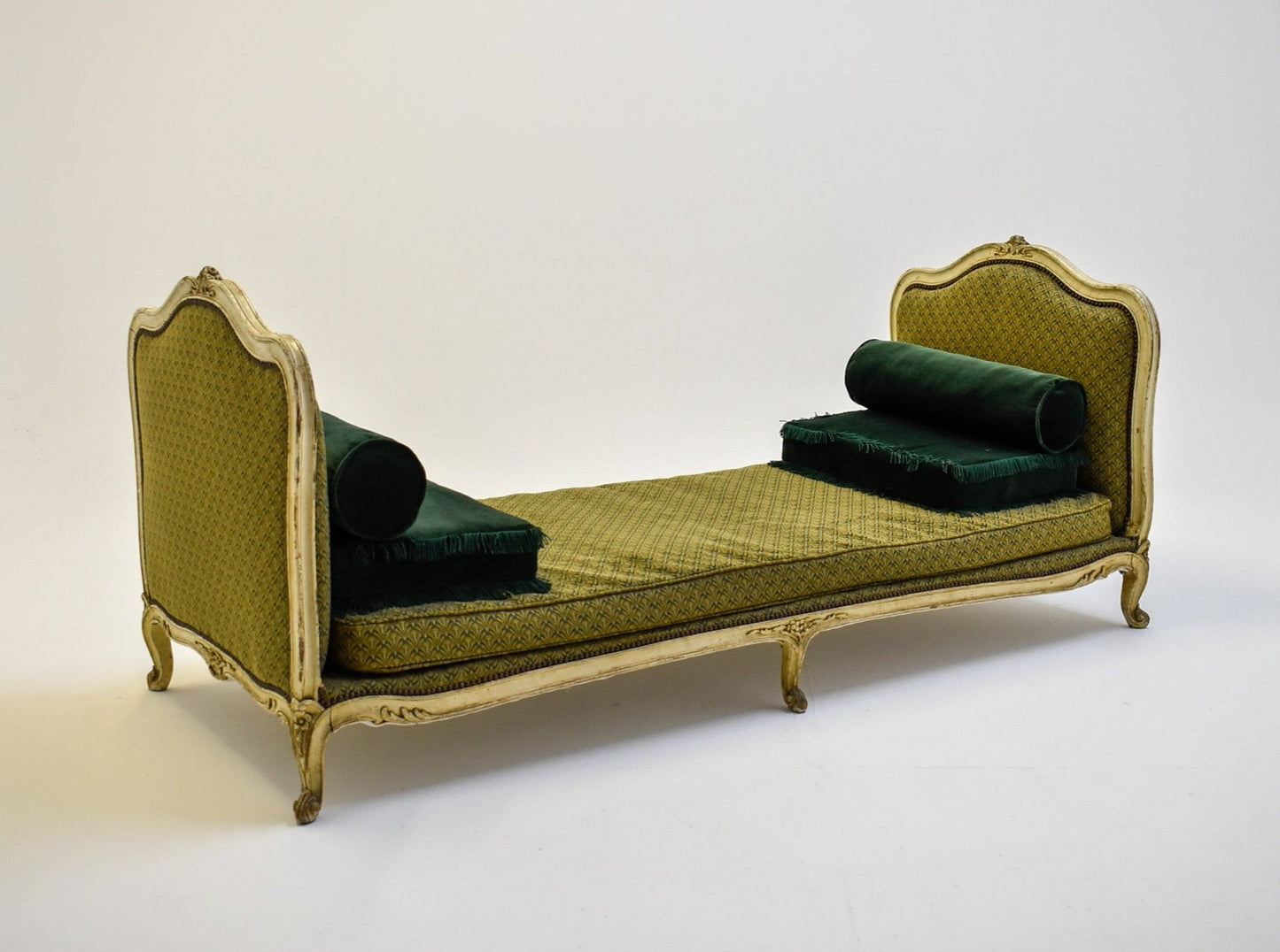 Diván victoriano con Tela Art Decó verde con diseño de abanicos y cojines de terciopelo verde