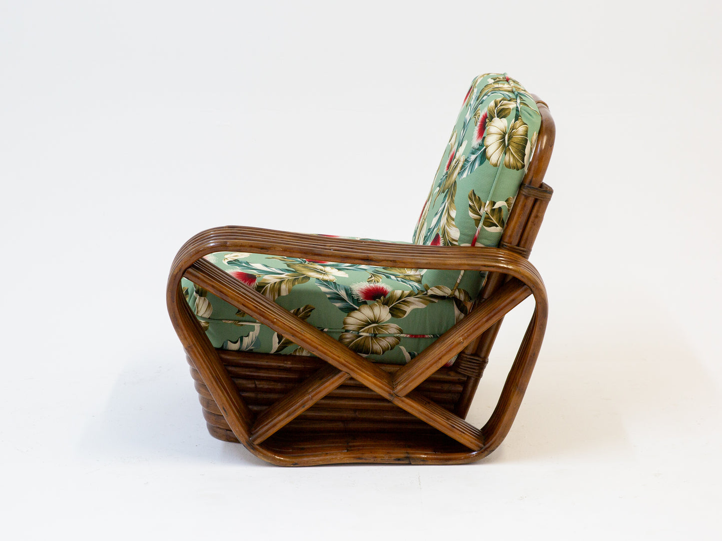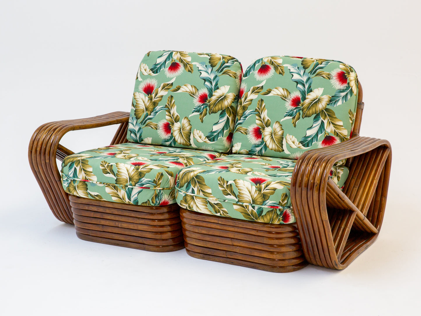 Sofá de bambú oscuro con tela tapizada floral verde lima