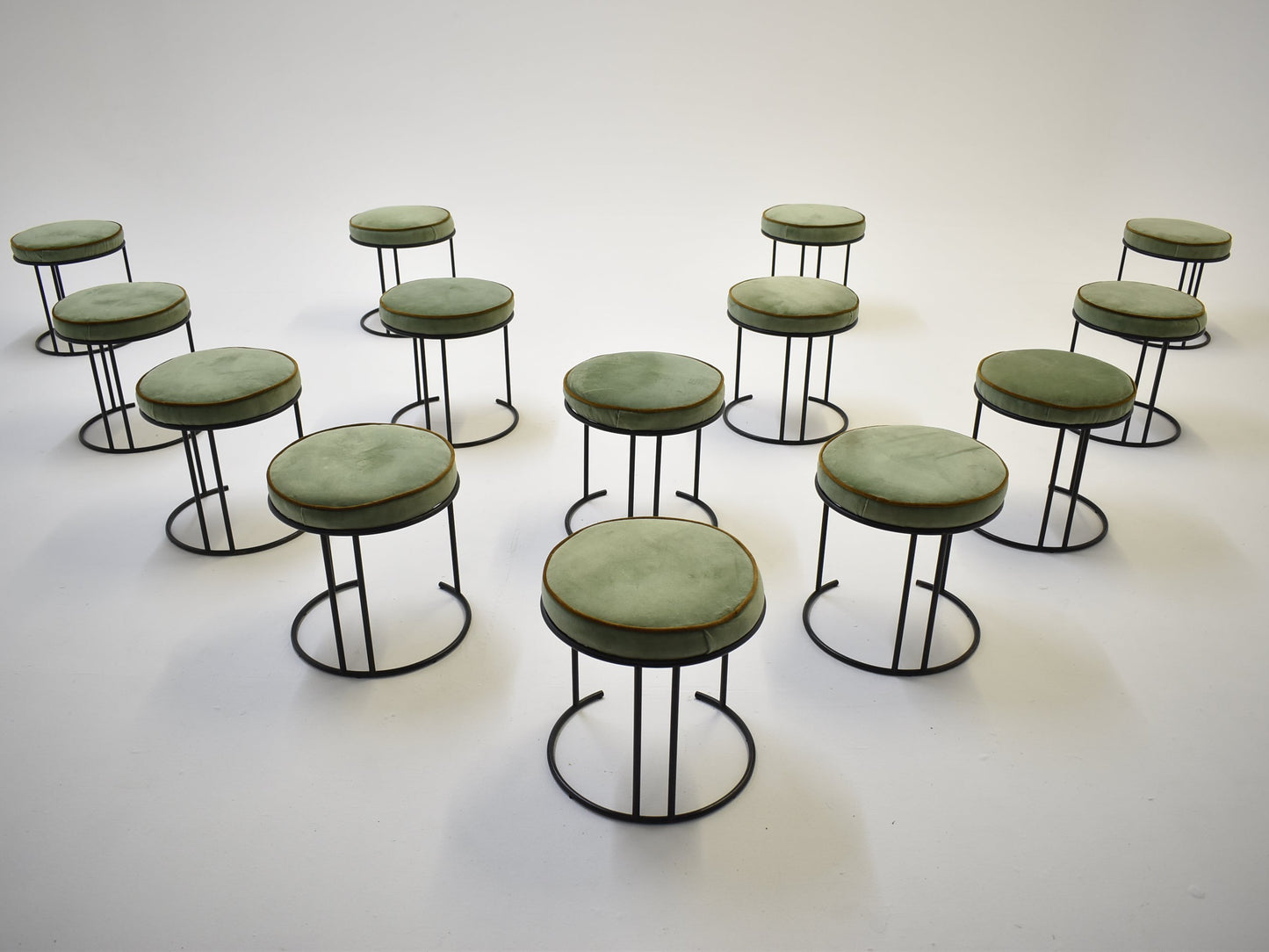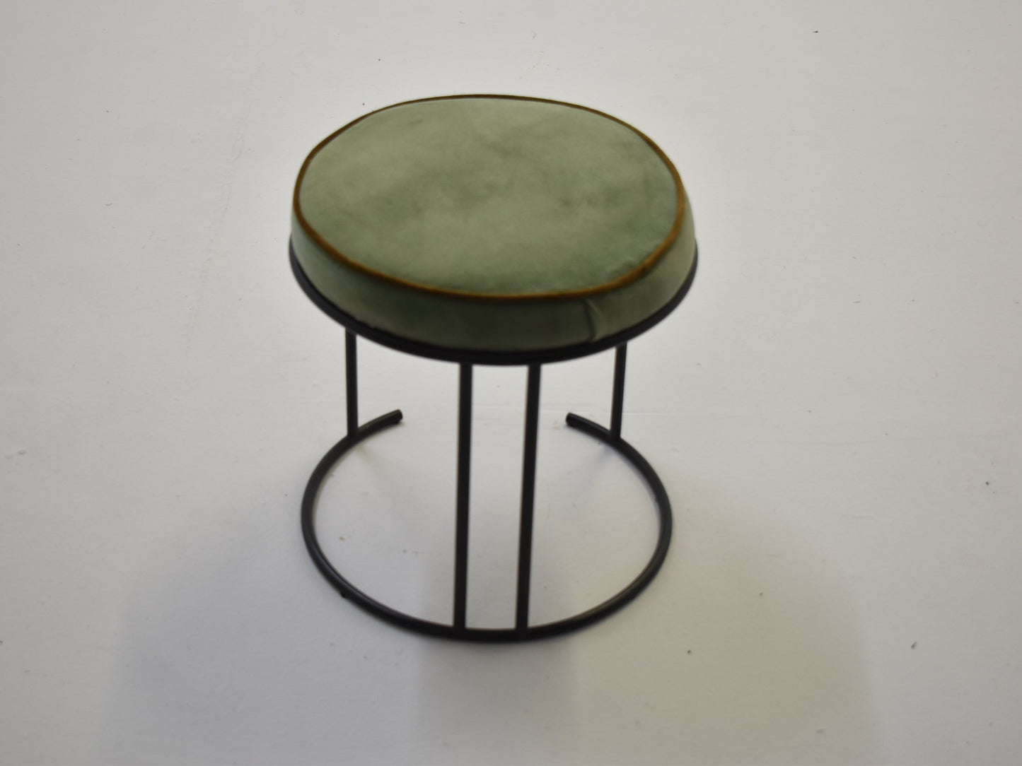 Taburete contemporáneo de acero con tapizado de terciopelo verde oscuro y ribetes en color caramelo claro