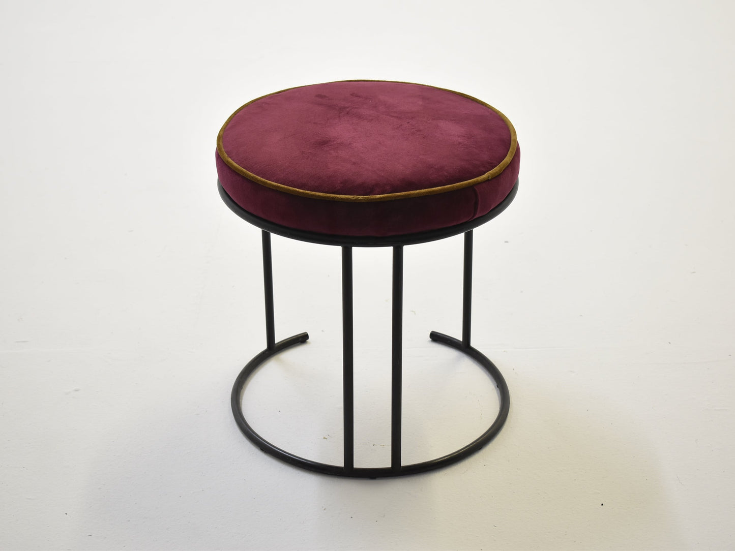 Taburete contemporáneo de acero con tapizado de terciopelo color frambuesa y ribetes en color caramelo claro