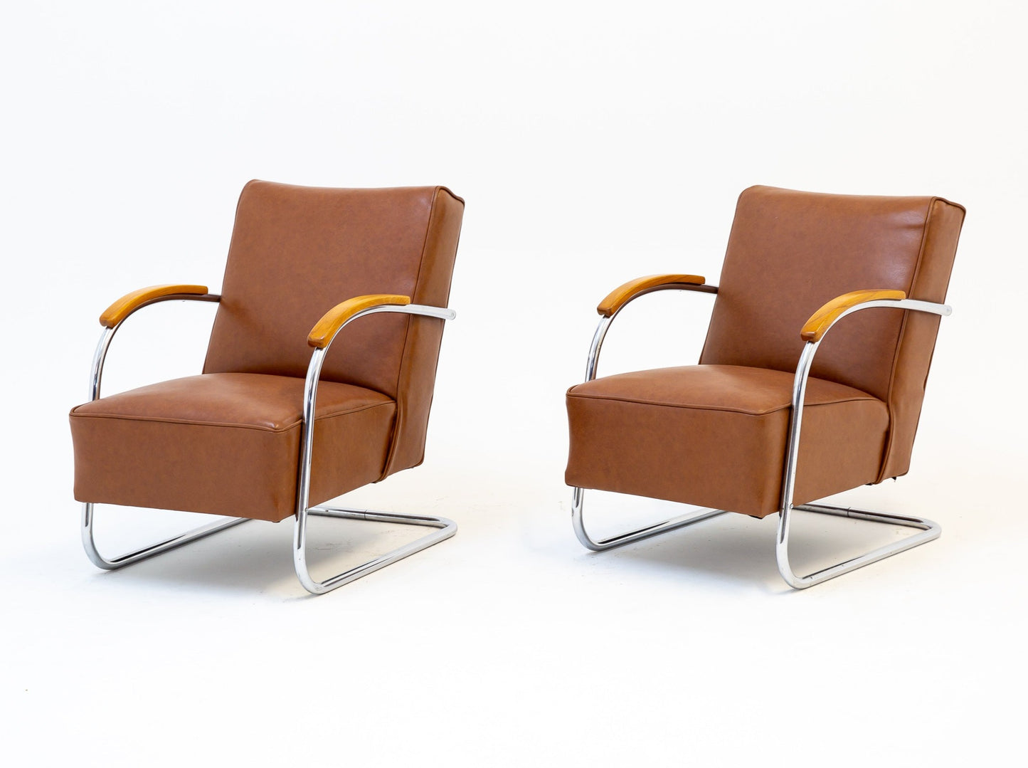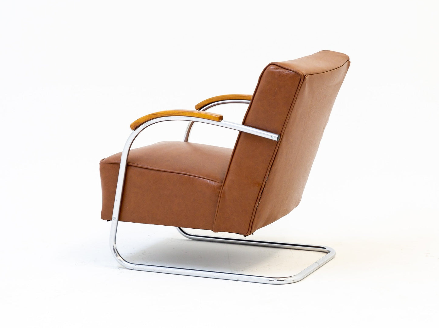 Bauhaus Tubular Steel and Brown Leather Mücke Melder Cantilever Armchair by Marcel Breuer