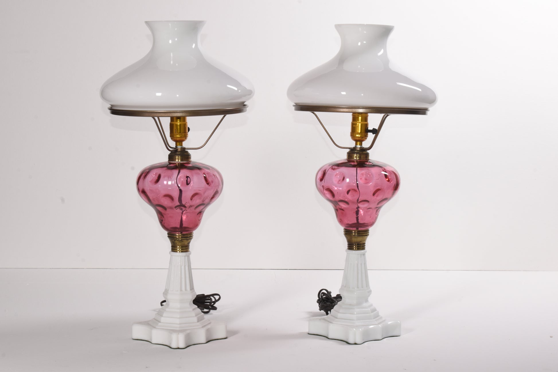 Pair of Antique Oil Style Parlor Lamps with Ruby Red Glass Details