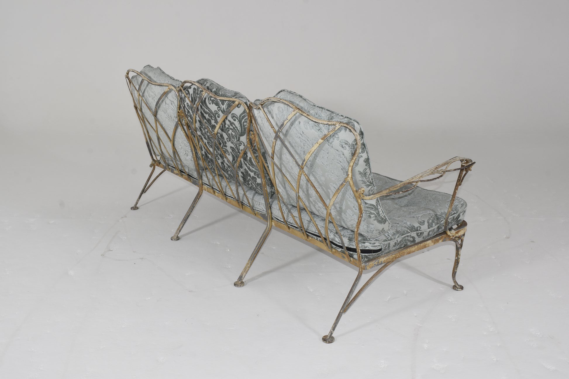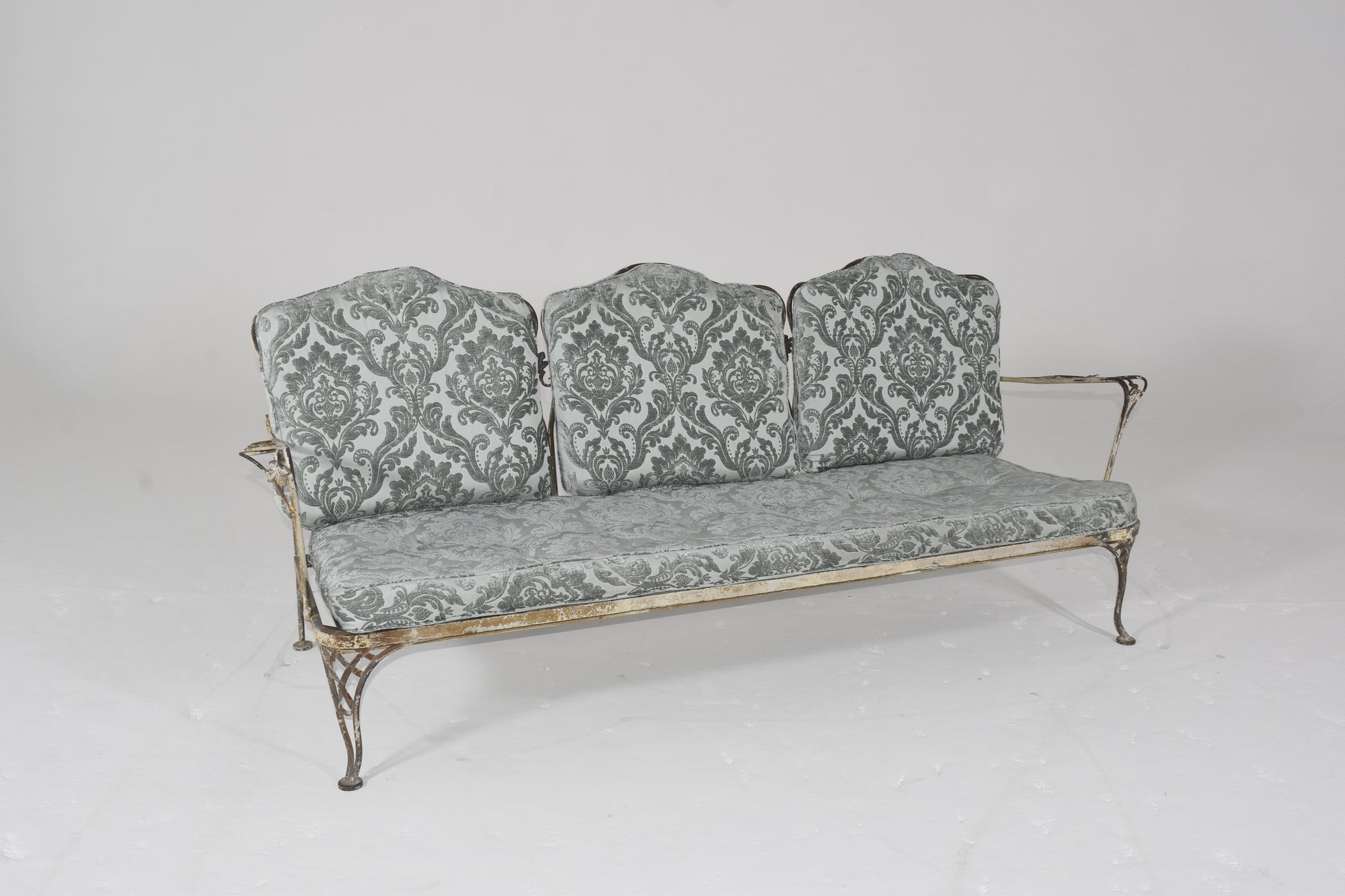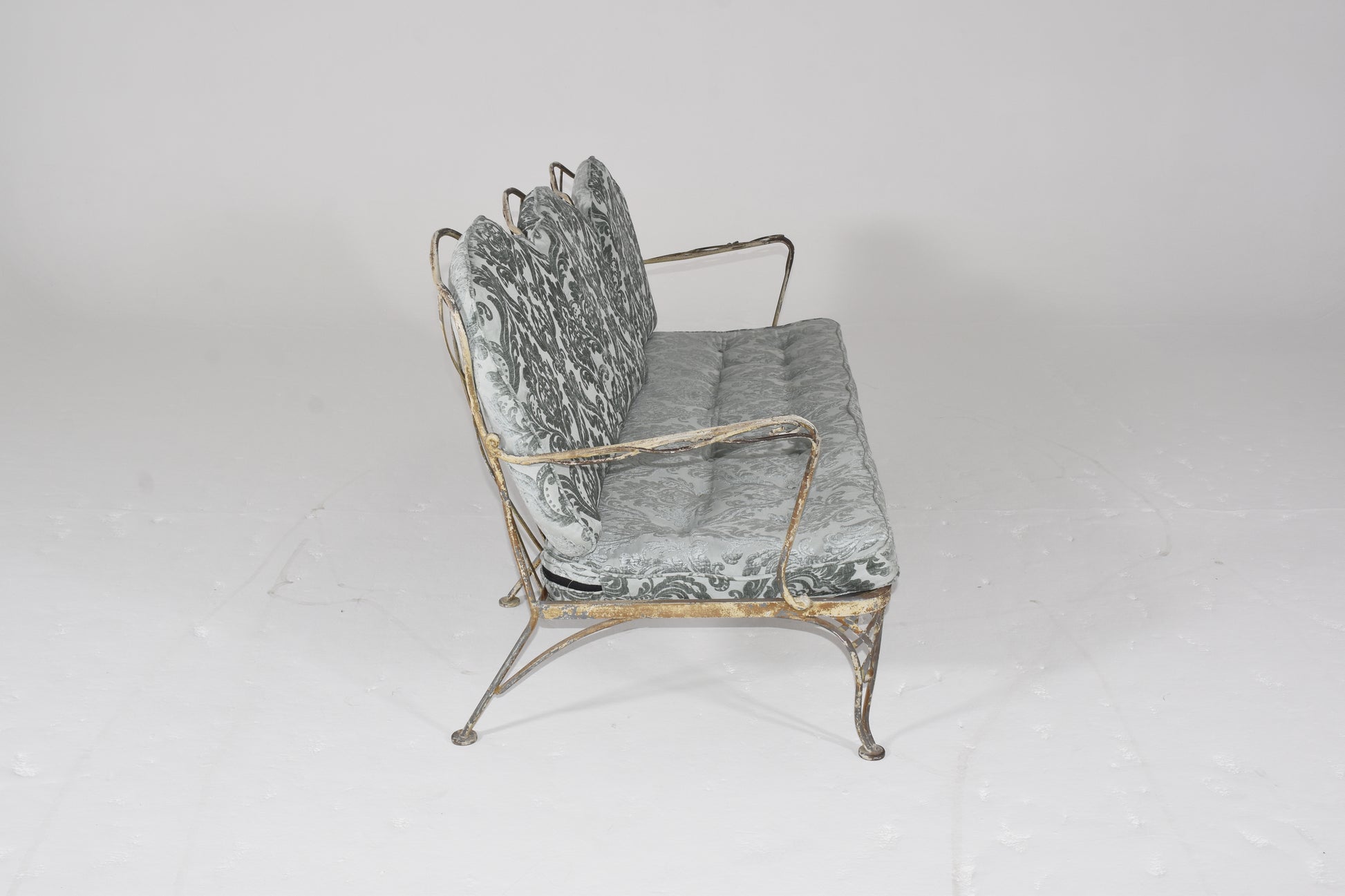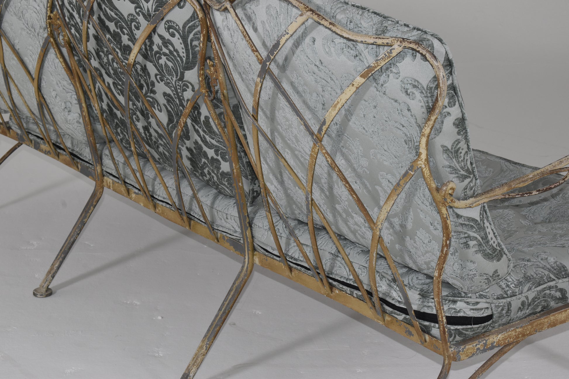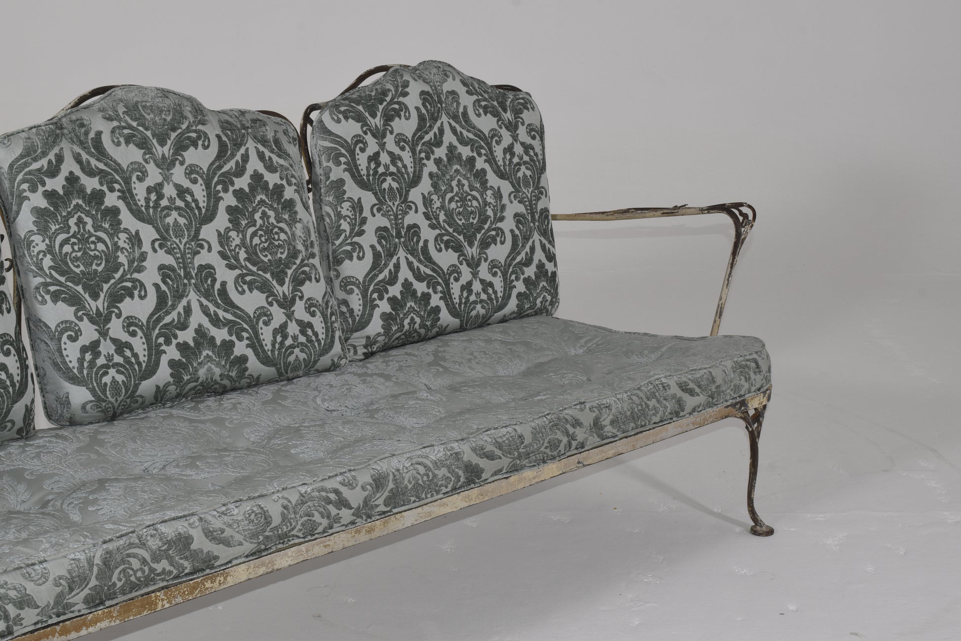 French Wrought Iron Vintage Two Seater Sofa with Damask Print Upholstered Cushions in Light Green Tones